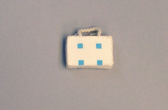 Tasje van karton, bekleed met wit katoen met blauwe ruijes. Handvaten van gedraaide witte wol.- Trefwoorden