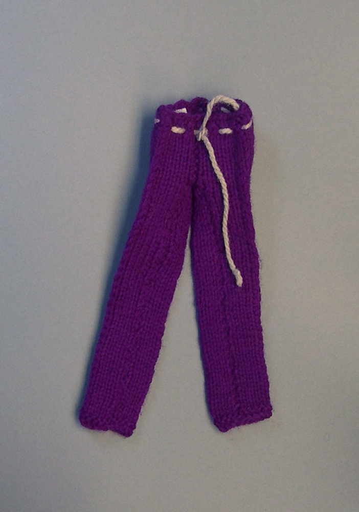 Lange, paarse broek gebreid van wol, met wit draad als gordeltje.- Trefwoorden