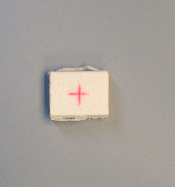 Koffertje, bekleed met wit vilt. Hierop een rood kruis getekend. Handvatten van gedraaide wol.- Trefwoorden