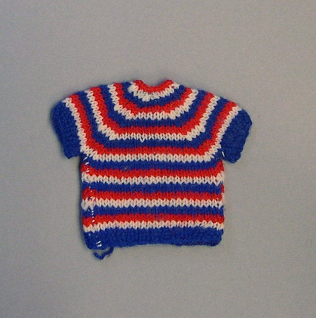 Gestreept truitje van rode, blauwe en witte wol.- Trefwoorden