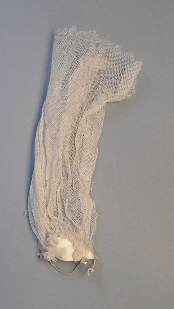 Sluier van tule op satijn, met elastiek als sluiting en knoopjes aan de zijkant.- Trefwoorden