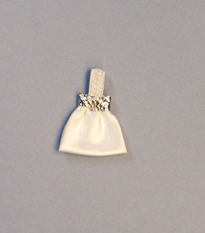 Tasje van satijn met aan de bovenkant een plastic pandje en elastiek als handvat.- Trefwoorden