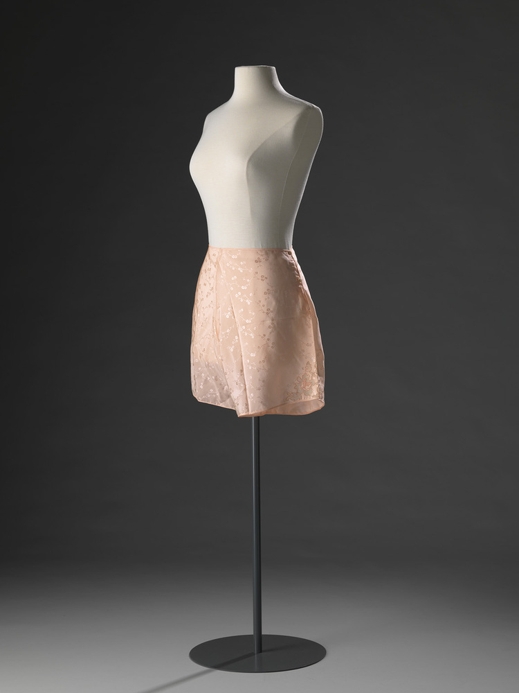 Tijdens het interbellum bleef de vorm van de nachtjapon in essentie hetzelfde. De pyjama was echter nog steeds een nieuwigheid en kende vele vormen. Waar in de jaren twintig het jongensachtige figuur in de mode was, kreeg in de jaren dertig het vrouwelijke silhouet weer de voorkeur. De verleidelijke avondjaponnen werden geïmiteerd in de nachtjaponnen: met een lage halsuitsnijding, semi-transparante materialen en splitten. Maar ook de slanke lijn en uitwaaierende rokken zien we in de nachtkleding terug. De ietwat mannelijke pyjamabroeken, werden aan de onderzijde verwijd zodat als men stond het net een lange rok leek. Deze kenmerken zien we ook terug in de tweedelige pyjama van Gerzon. De top heeft aan de voor- en achterzijde een lage V-hals en op tailleniveau twee striklinten die op de rug gestrikt worden. De broek heeft een glad heupstuk, waaraan de lange pijpen met platte plooien zijn aangezet. De pijpen zijn onderaan verwijd door middel van driehoekige inzetjes, die versierd zijn met bloemmotieven (uitsparingen) op crèmekleurig tule. In deze periode had het ondergoed allerlei kleuren, maar wit werd opvallend weinig gebruikt. Materialen varieerden van kunstzijde en satijn, crêpe de Chine, shantung, met garneringen van crèmekleurige kant of Valenciennes kant. Zowel de onderjurk, onderbroek als de tweedelige pyjama zijn gemaakt van lichtroze kunstzijde met een ingeweven bloem- en bladmotief. Allen zijn versierd, weliswaar op verschillende plaatsen, met het identieke bloemmotief (uitsparing) op crèmekleurig tule. Ook de bijbehorende verpakking is bewaard gebleven; Een rechthoekige kledingdoos van bruin karton met op de deksel een opdruk in zwart: een wereldbol met daaronder 'G.G.' / 'Gerzon's MODEMAGAZIJNEN'. ( Judith van Amelsvoort)