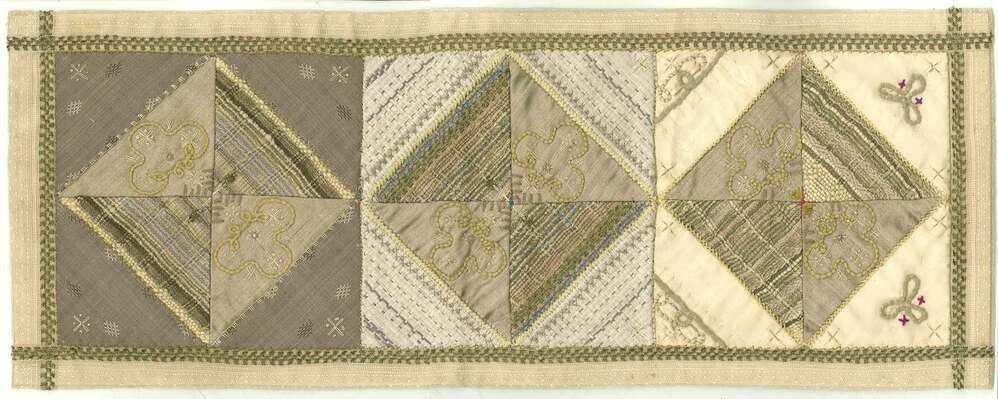 Rechthoekige borduurlap, verdeeld in drie vierkanten, opgebouwd uit driehoekige lapjes.