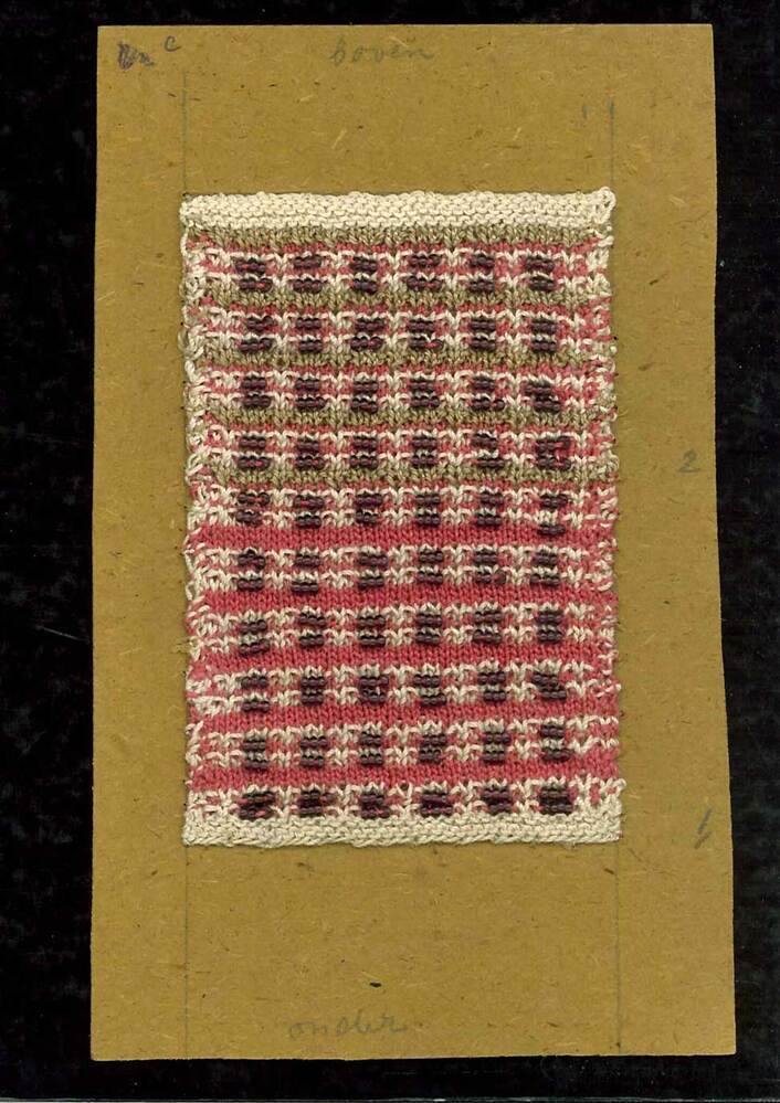 Borduurwerk in rood, wit en lichtbruin garen met daarin bruine glazen kraaltjes verwerkt. Geheel op rechthoekig karton genaaid, waarop in potlood boven- en onderzijde is aangegeven. Op bijgevoegd papiertje is in potlood geschreven: 'schapevlees, 153'; Aan ommezijde is in blauwe pen geschreven: 'voor 9e druk Handwerken/ voorbeelden om na te werken/ te fotograferen'.