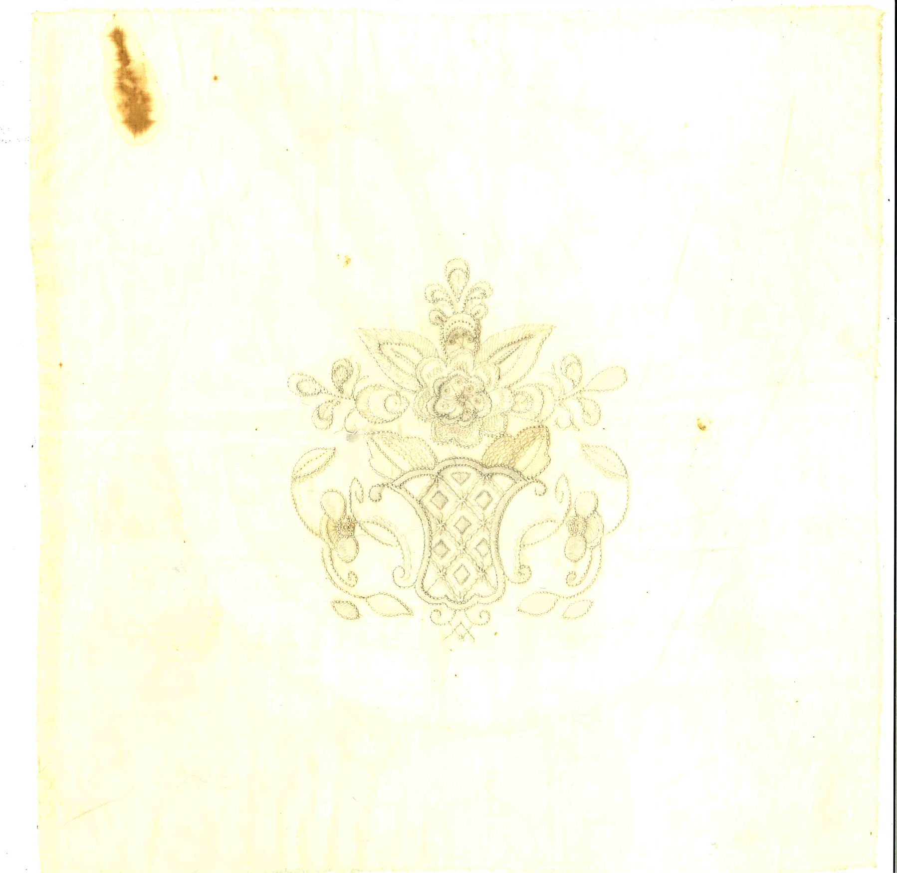 Wit doorschijnend tule met blad- en bloemmotieven in wit garen. Bruine vlek in linker bovenhoek.