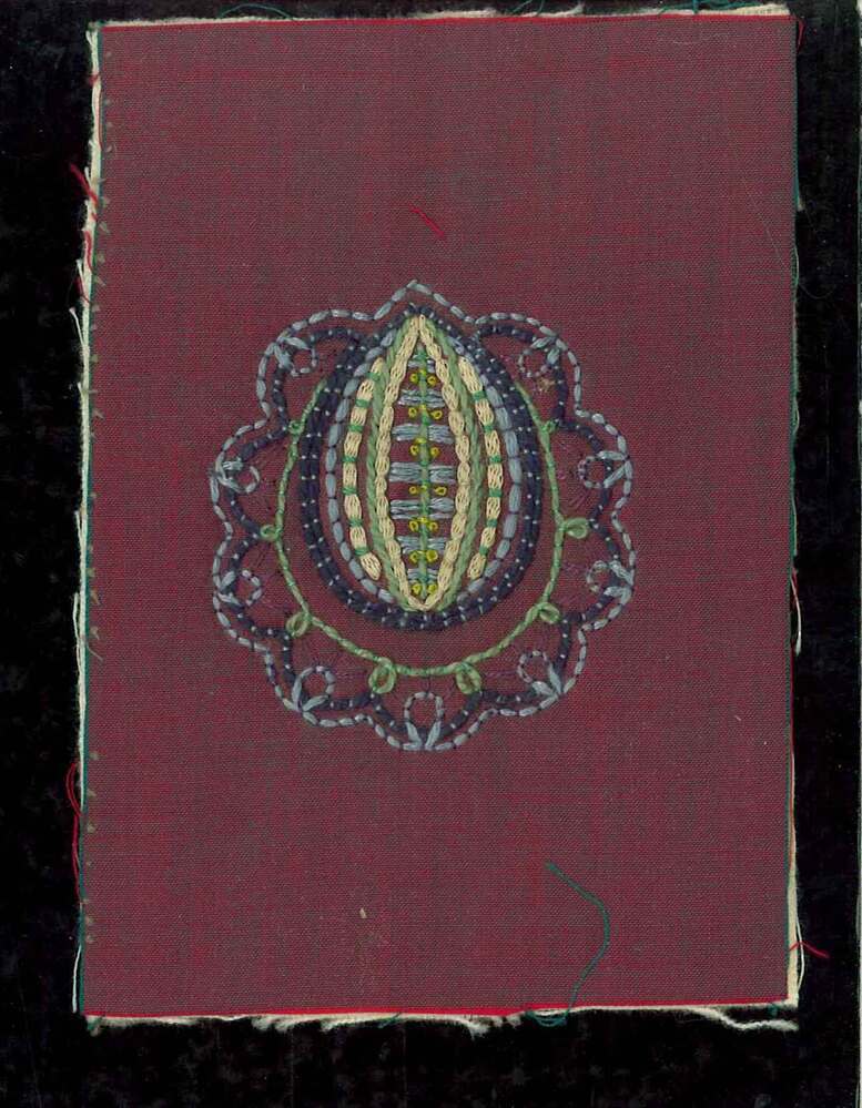 Paarsrode katoenen Ploeg-stof met wit vilt als onderlaag. Daarop is strooimotief geborduurd met licht- en donkerblauw, blauwgroen en grijsgroen garen.