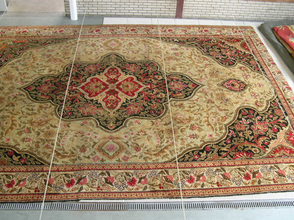 Pooltapijt. Heeft rand met bloempatroon. Het middenveld bestaat uit een medaillon met bloemen in de kleuren zwart, olijfgroen, geel en beige.- Trefwoorden