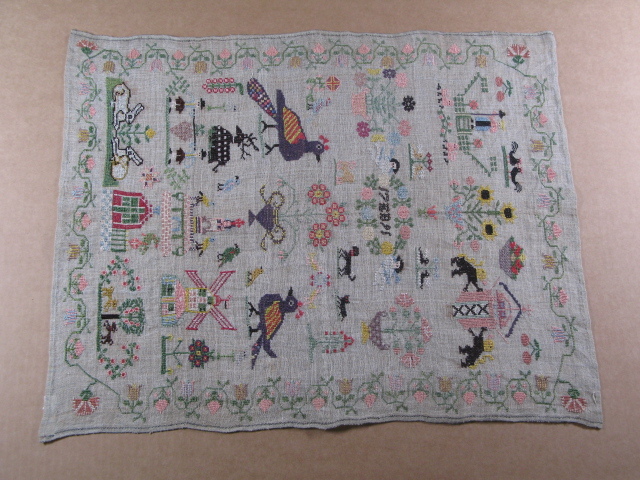 Dit is één van de drie doeken van een achttiende-eeuwse borduurster die de initialen EB draagt (KA 1024, KA 1028 en KA 1029). Haar werk is van hoge kwaliteit. Des te spijtiger is het dat haar naam onbekend is gebleven. Deze doek uit 1791 laat zien dat, naast haar twee stoplappen, ook haar borduurlap een knap staaltje handwerk is. De doek is bezaaid met klassieke merklapmotieven, aangevuld met kleine vulmotiefjes. De borduurster lijkt welhaast angst voor lege ruimten te hebben; geen plek blijft onbenut. Bekende motieven zijn de Verspieders van het Heilige Land, de Nederlandse Maagd in de Hollandse Tuin en de zwevende engelen met bloemenkrans. Verder is de doek bezaaid met manden en kuipen vol anjers, tulpen en rozen en een uitgebreide beestenboel zoals herten en konijnen, met kleine uiltjes, vogeltjes, katten, honden en leeuwtjes als vulmotief. De herkomst van de doek is onbekend, maar het stadswapen van Amsterdam en de pauwen wijzen naar Amsterdam. Dergelijke grote, opvallend kleurrijke en vol geborduurde pauwen lijken alleen op Amsterdamse doeken voor te komen. De doek meet 47 bij 37 cm. De borduurster maakte gebruik van zijden garen op los geweven linnen. Ze heeft voor deze, net als voor de andere twee doeken, gebruik gemaakt van uitgesproken kleuren, in dit geval veel roze en rood. Omdat garens veelal met de hand geverfd werden en sommige pigmenten niet kleurvast waren, konden de donkere tinten gaan bloeden. Op deze doek zijn dat voornamelijk de bruine en zwarte garens. (Suzette van 't Hof)