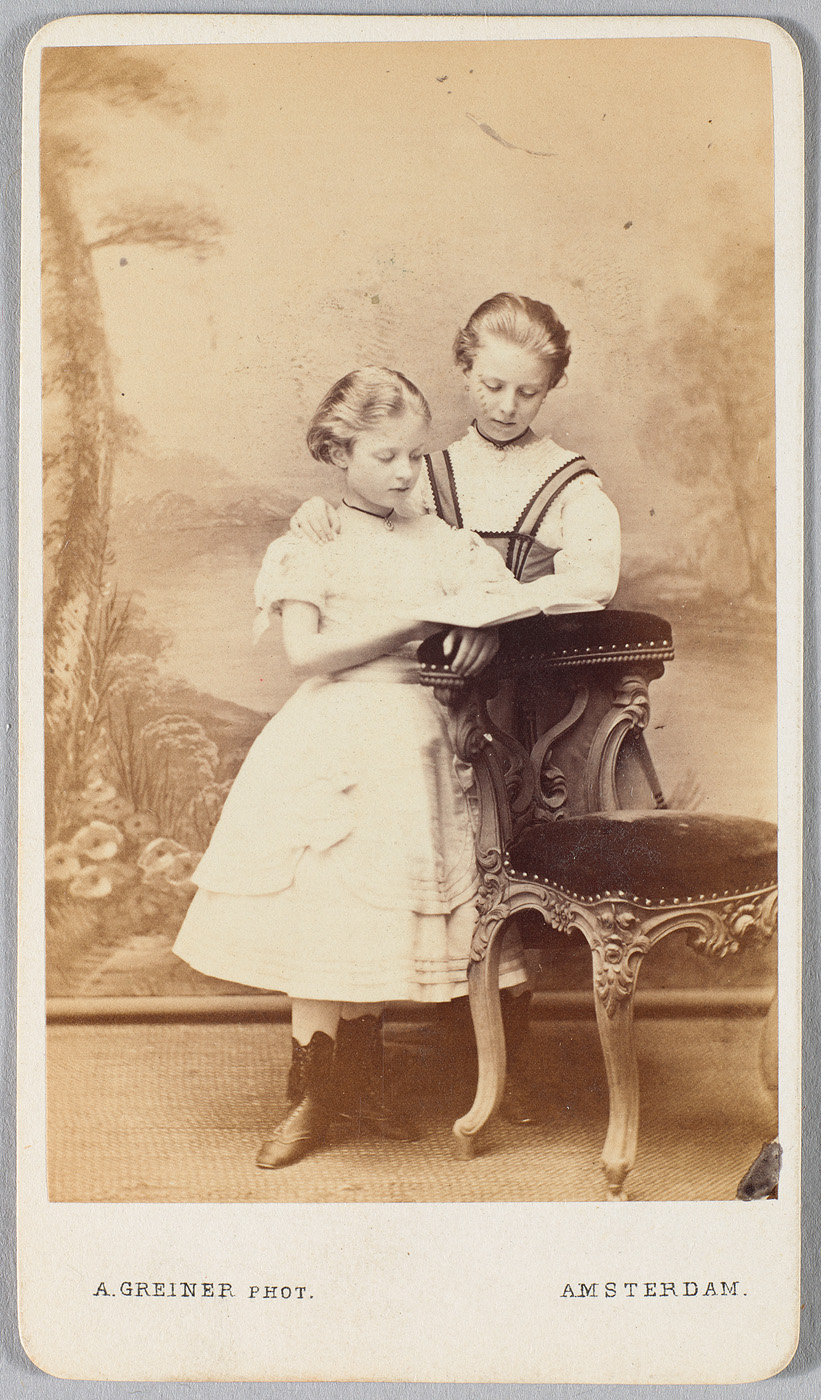 Deze ‘naamloze’ meisjes zijn met twee Greiner foto’s in het kleine album van Louisa Willet-Holthuysen vertegenwoordigd. Zijn het zusjes van elkaar en nichtjes van het echtpaar Willet-Holthuysen? Hun ouders wisten in elk geval de weg naar een van de meest productieve portretfotografen in Amsterdam te vinden. Albert Greiner was afkomstig uit Duitsland en vestigde zich in 1862 in de hoofdstad, waar hij een perceel aan de Nieuwendijk (nu nr. 89) betrok, ook toen al een drukke winkelstraat met veel passanten. ( Bert Vreeken)