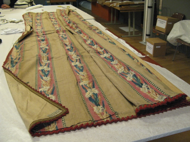 Katoen gevoerd gordijn van gestreept katoen. Dessin afwisselend effen en gebloemd gescheiden door smalle stippen randen. Hoofdkleur is geel/goud, de bloembanen zijn rozerood/wit/groen. Eén lange zijde en onderkant omgezoomd met een geweven band met rode franje. Bovenzijde gezoomd met zwart band met daaraan 17 koperen ringen, een ring ontbreekt. Gordijn lijkt vermaakt, halverwege zit een oude stiklijn. In een bovenhoek is met pen IV geschreven.