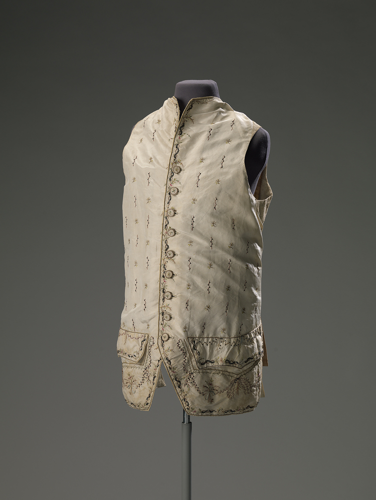 Herenvest van crèmekleurige zijde, versierd met borduurwerk van bloemen met pailletten. De voorpanden zijn op taillehoogte schuin weggesneden.