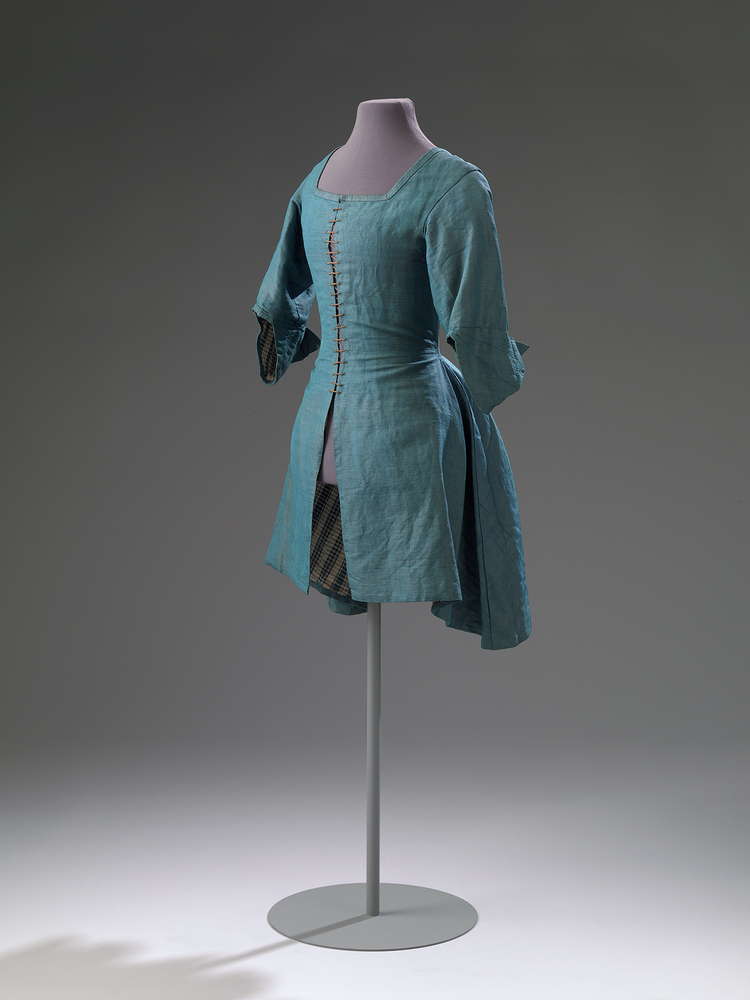 Jak of caraco van groenblauwe ripszijde met rood draad genaaid. Lage vierkante hals. Halflange rechte mouwen met geplooide ellenboogstukken in de vorm van een punt (varkensoren of vleugeltjes). Vanuit de taille wijd uitlopend door ingezette geren. Op de rug twee stolpplooien. Rijgsluiting middenvoor met handgenaaide gaatjes en een bruine rijgveter met metalen nestels. Het jak is geheel gevoerd met linnen met een ingeweven blauw ruitmotief.