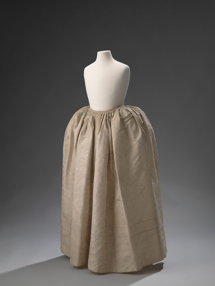 Wijde rok van witte ripszijde met een groot gebrocheerd bloem patroon. De rok is in de 18e eeuw vermaakt, dit is te zien aan het soort naaisel, de zoom en de plooien langs de tailleband. Langs de bovenrand is een voering te zien die later is toegevoegd.- Trefwoorden