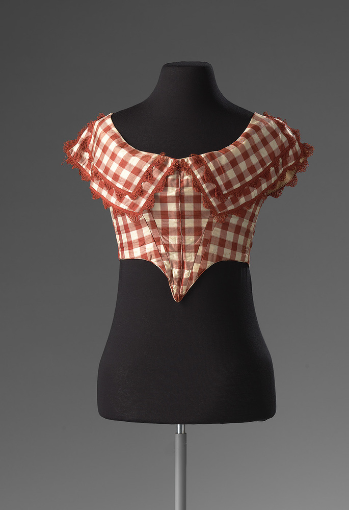 Mouwloos avondlijfje voor jong meisje, van bruin geruite tafzijde, puntig van voren. Afgebiesd met stroken kant. Sluiting middenachter. De mouwen zijn eruit geknipt. Onduidelijk is wanneer dit is gebeurd. Waarschijnlijk zat er een korte, strakke mouw in, maar een lange mouw was ook mogelijk. Gevoerd met cremekleurige stof.
