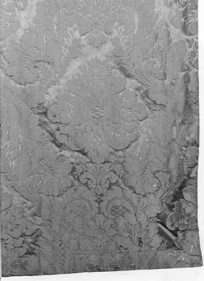 Overgordijn van groen damast met ingeweven bloem-/bladmotief. Voering van gele voeringkatoen (zgn. satinet). Molton tussenvoering. Bovenrand is geplooid door middel; van 14 ijzeren gordijnhaken.- Trefwoorden