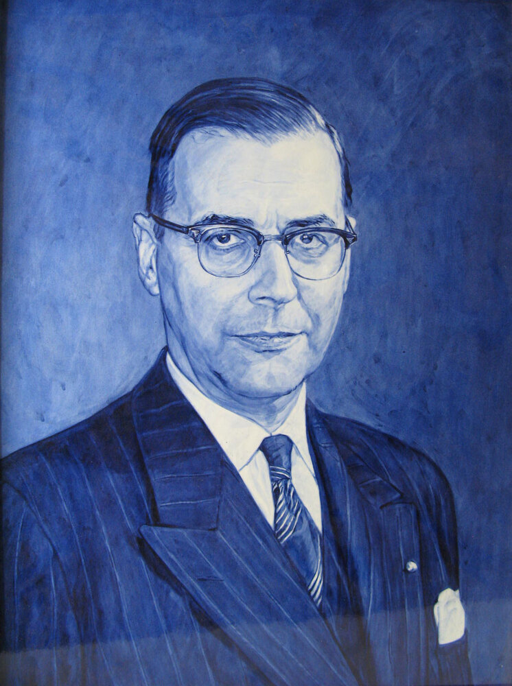 Ingelijste Delftsblauwe tegel met portret. Op achterzijde tekst, in blauwe sierletter: Aan/ Mr. G. van Hall/ op/ 17 december 1958/ aangeboden door de/ N.V. Focke & Meltzer/ Amsterdam/ bij gelegenheid van de feestelijke/ heropening van haar zaak./.