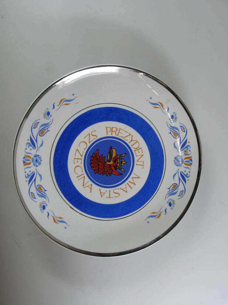 Bordje met opdruk: gekroonde vogelkop met er omheen rondschrift 'Prezydent Miasta Szczecina'.- Trefwoorden