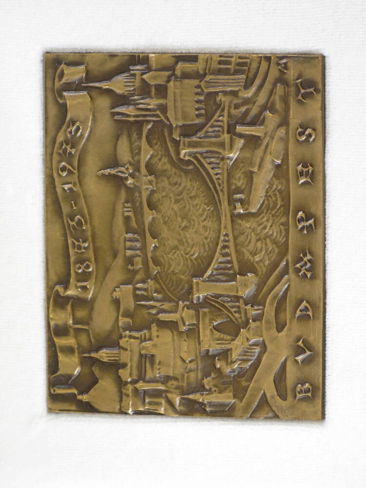 voorzijde: de stad Budapest aan de rivier de Donau, verbonden met bruggen. Bovenaan een lint met opschrift. Onderaan een opschrift.- Trefwoorden