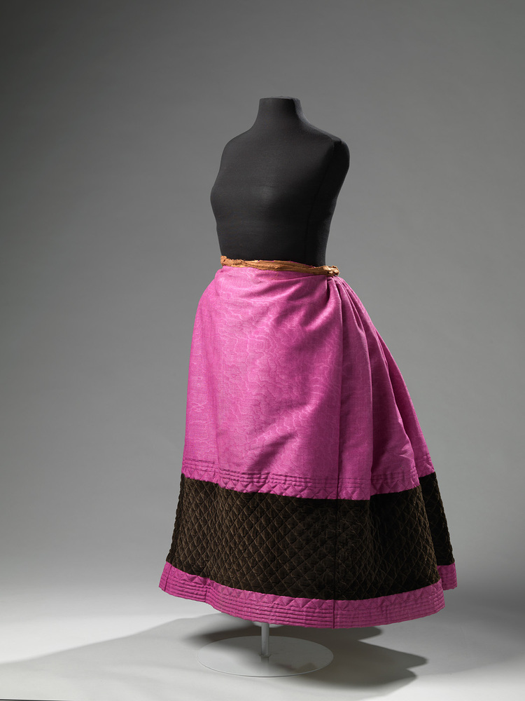 Wijde onderrok van gemoireerde roze 19e eeuwse voeringstof, met een brede zwarte fluwelen rand, in ruiten doorgestikt. Door de fluwelen rand en de stijve stof staat de rok wijd uit. Sluiting met bandjes aan de achterzijde. De band is opnieuw geplooid, en is misschien niet origineel. Mogelijk Noord-Hollandse rok.