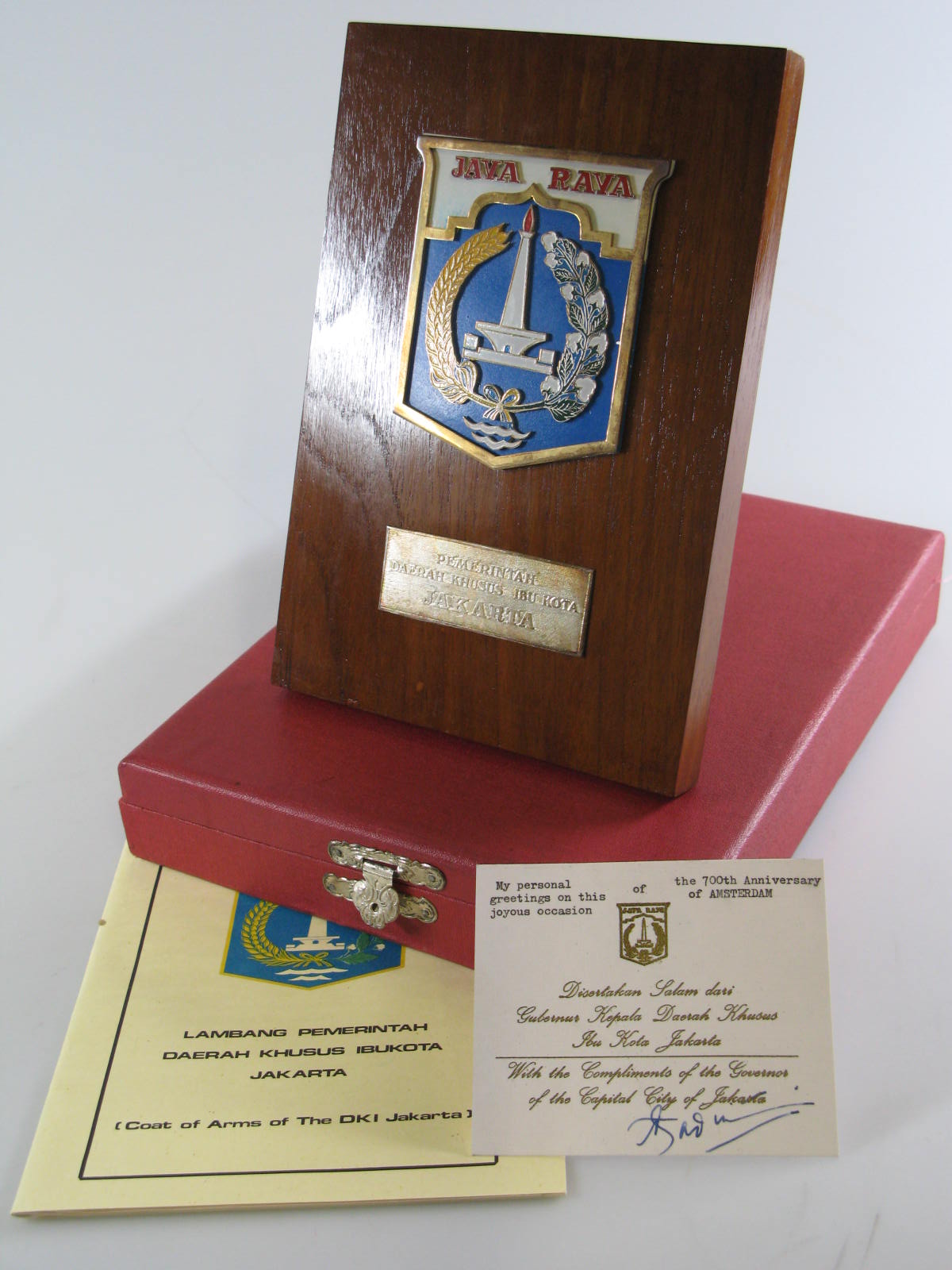 - Plaquette met wapen van Java Raya en tekstbordje JAKARTA, in rood kistje, 1975