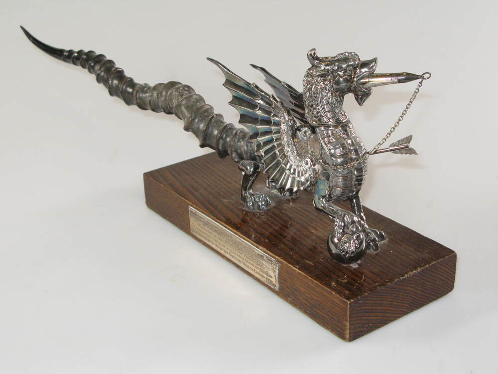 - Olielamp in vorm van draak uit stadswapen van Cardiff, geschonken bij bezoek van burgemeester van Cardiff in 1952, 1950 - 1952