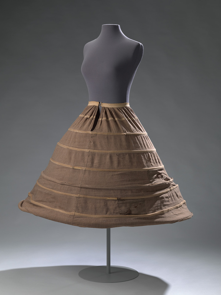 Crinoline van donker bruin katoen met horizontaal ingeweven lichtbruine tunnels voor de hoepels. Tailleband met dubbel geweven onderzijde, waartussen de rok is bevestigd. Middenvoor een metalen gesp sluiting, waarvan één deel ontbreekt. De rok is gerimpeld aan de tailleband gezet. Middenvoor een split voor de instap. Zeer waarschijnlijk is de rok later vermaakt waardoor de split aan de achterzijde lijkt te zitten. De onderste zeven van de acht tunnels zijn voorzien van metalen hoepels omsponnen met katoen. De hoepelrok is geheel met de hand genaaid.