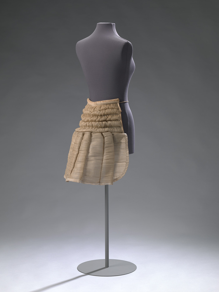 De lange tournure van lichtgekleurd paardenhaar heeft een opgevulde tailleband. Dit model dateert uit 1869. In december van dat jaar verscheen een identiek model in het Nederlandse modetijdschrift De Gracieuse (1862-1936). Het binnenwerk is met behulp van een katoenen lint op te spannen. ( Judith van Amelsvoort)