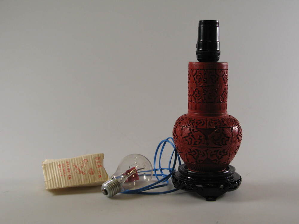 Elektrische lamp met rood geverfd houtsnijwerk met bloemotieven (1) in groene kartonnen doos (2). Met losse gloeilamp (3).- Trefwoorden