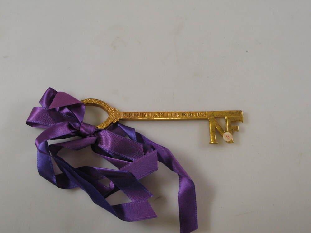Koperen sleutel, met o.a. tekst NIAGARA FALLS NEW YORK/ INCORPORATED-MARCH 17, 1892/ (1). Aan sleutel is paars lint gestrikt. Geborgen in beige kartonnen doosje (2).- Trefwoorden
