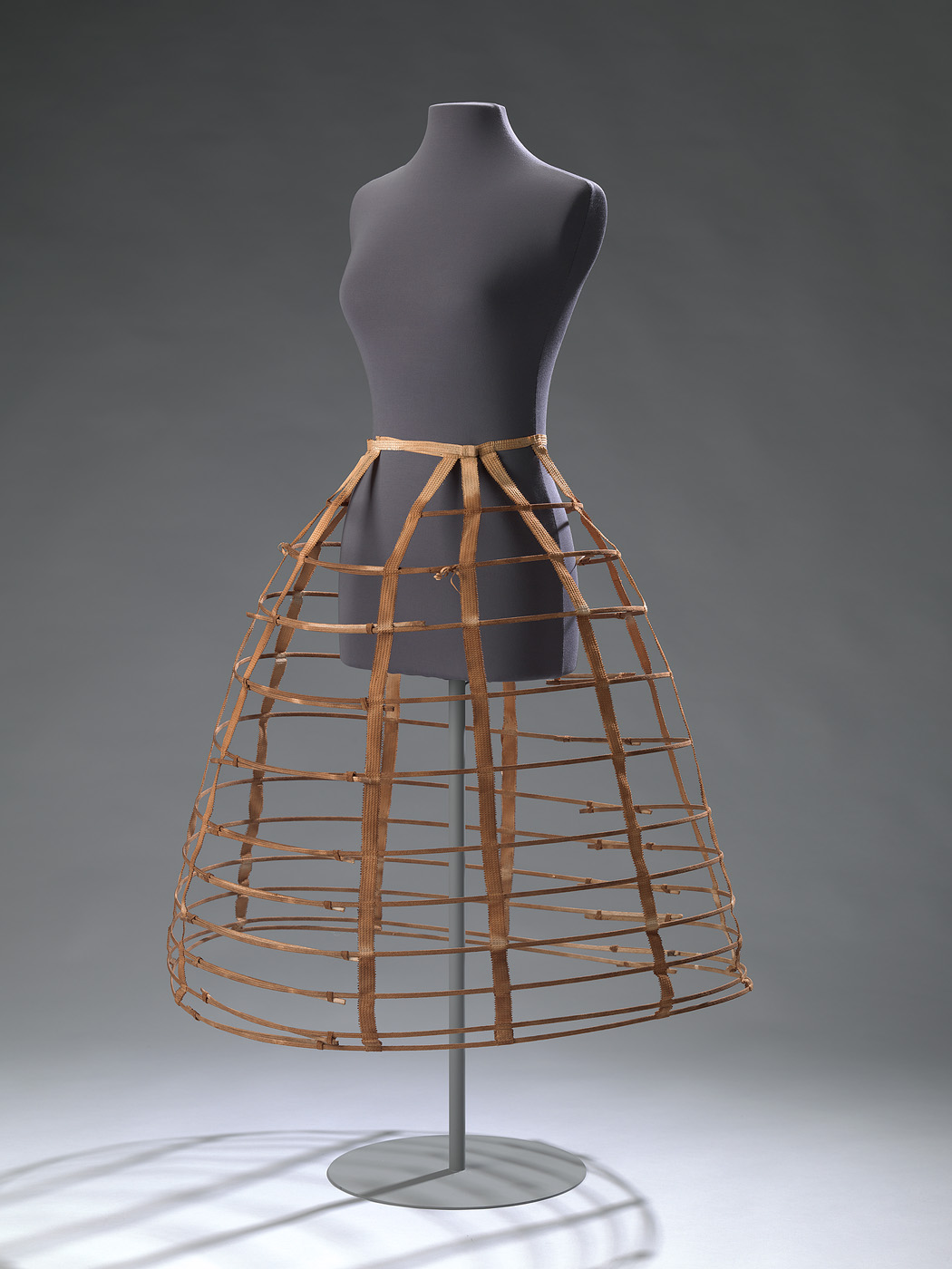 Crinoline van crèmekleurig katoen. Elastisch tailleband aan de voorzijde gesloten met messingkleurig metalen haak en oog. Aan de tailleband zijn tien verticale banden gezet van decoratief geweven katoen. Hieraan hangen elf stalen hoepels, die zijn omsponnen met katoen. De afstand van de onderste twee hoepels is kleiner dan de overige hoepels.