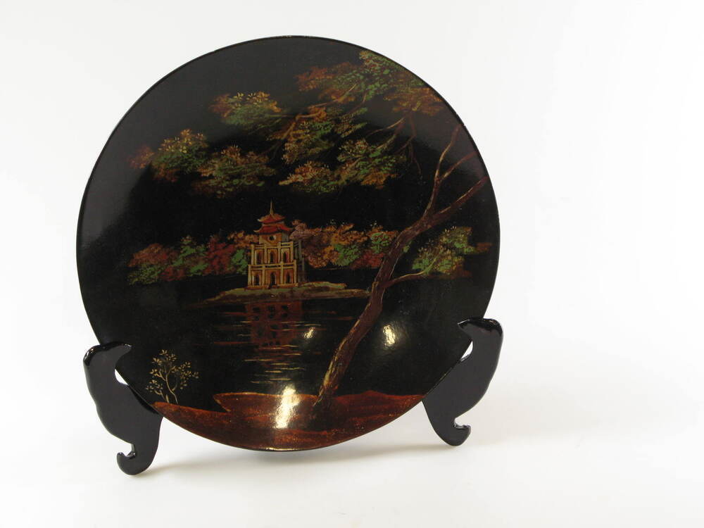 - Zwart bord met voorstelling van tempel met standaard in kartonnen doos, 1900 - 1999