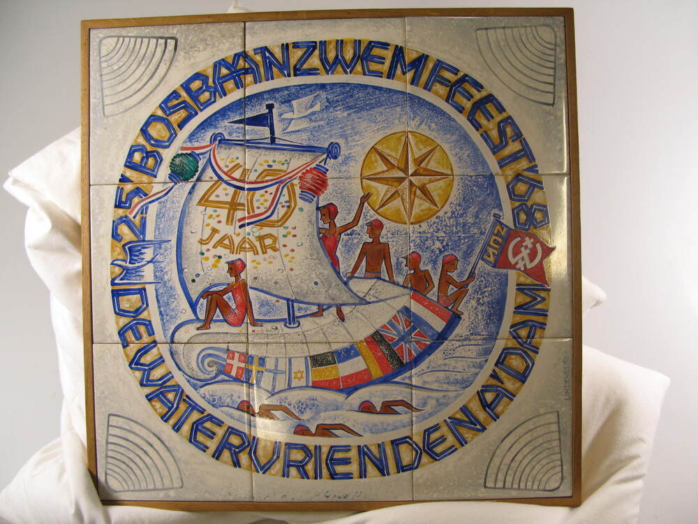 Een tegeltableau is een vlak, bestaande uit meerdere aardewerken tegels, die door een schildering één voorstelling vormen. Tegeltableaus werden vanaf de zeventiende eeuw populair, omdat ze zowel decoratief als functioneel waren. Ze boden uitkomst tegen vocht, waar huisjes langs grachten en kanalen nogal eens last van hadden, en waren gemakkelijk schoon te houden. Daarnaast zorgden de uit Italië afkomstige vormen, kleuren en motieven voor een vrolijke aanblik rond de haard of in de gang. In de periode van de Jugendstil (ca. 1900) leefde de aandacht voor tegeltableaus opnieuw op. Families en bedrijven die het zich konden veroorloven, lieten wanden, gevels en portieken versieren met tegeltableaus in Art Nouveau stijl. Ook voor jubilea en andere feestelijke gelegenheden werden soms tegeltableaus vervaardigd. Dit tegeltableau is door Jacob Lindenberg ontworpen ter herinnering aan de 25e editie van het Bosbaanzwemfeest, georganiseerd door de Watervrienden Amsterdam, in 1968. ( Sarah Remmerts de Vries)