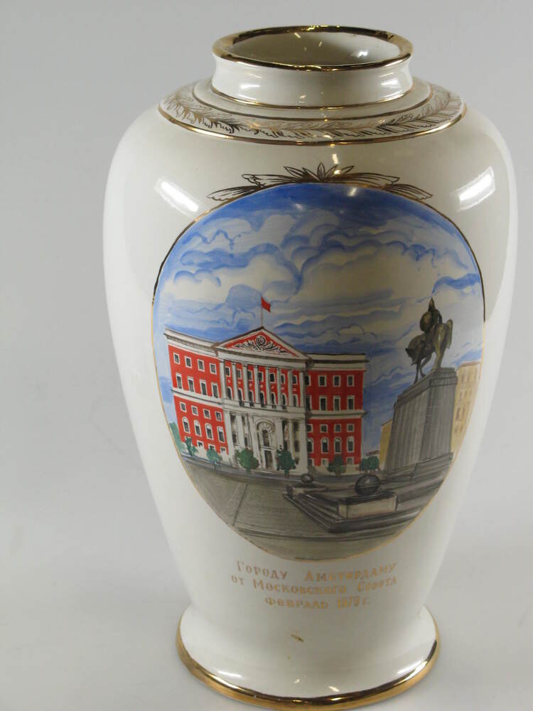 - vaas met voorstelling rood gebouw en standbeeld van man te paard, 1979