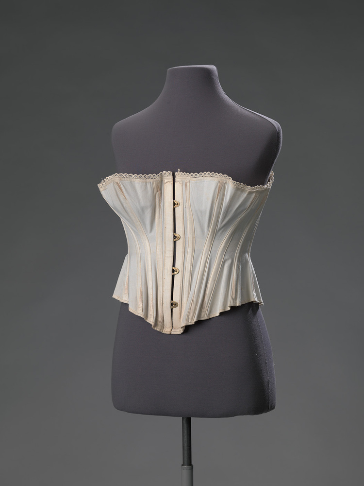 Korset van crèmekleurig katoen, verstevigd met 16 baleinen. De baleinen worden aan de boven- en onderzijde gefixeerd door grote steken van borduurgaren (vliegjes?). Bovenrand versierd met machinale katoenen kant. Middenvoor een deelbare busk, gesloten middels vier knopjes en ogen van messingkleurig metaal. De oogjes zijn versierd met een bladmotief. Middenachter een rijgvetersluiting met 20 messingkleurig metalen ogen en één crèmekleurige rijgveter. Op tailleniveau aan te halen. Aan de binnenzijde een crèmekleurige katoenen tailleband. Boven-en onderrand afgebiesd.
