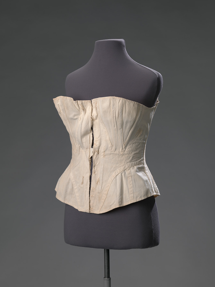 Korset van crèmekleurig katoen, volledig met de hand genaaid. Met 30 tunnels, verstevigd met 18 baleinen (niet volledig). Middenvoor busk en sluiting ontbreken. Vier borstgeren en vier heupgeren geven model aan het korset. De baleinen worden aan de boven- en onderzijde gefixeerd door grote steken van borduurgaren (vliegjes?). Middenachter een rijgvetersluiting, bestaande uit 30 messingkleurig metalen ogen en één crèmekleurige katoenen rijgveter, waarvan één uiteinde is afgewerkt met een nestel. De boven- en onderrand zijn afgebiesd.