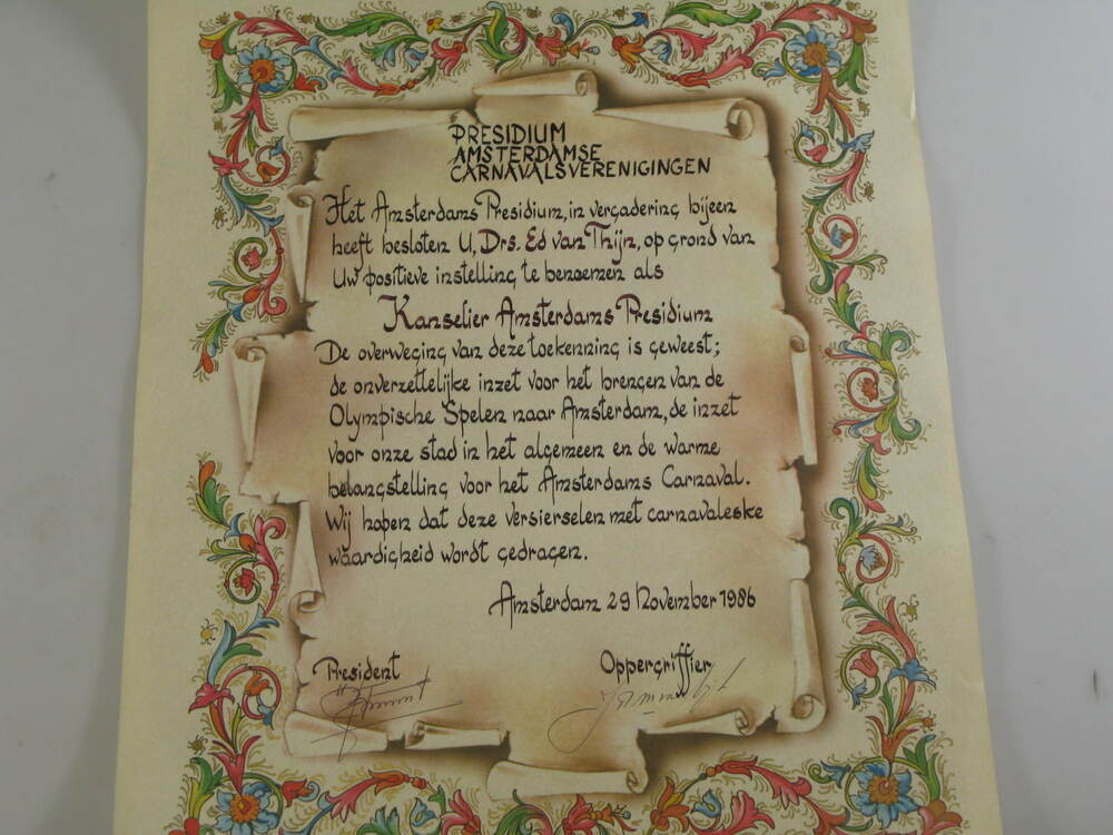 - Oorkonde Presidium Amsterdamse Carnavalsverenigingen, 1986
