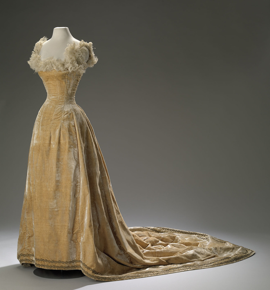 Deze opvallende gele japon van fluweel en afgezet met struisvogelveren is van Marie Van Someren Brand-Zoethout (1866-1897) geweest. Zij was de echtgenote van de eerste conservator van het Stedelijk Museum, Jan Eduard Van Someren Brand (1856-1904).