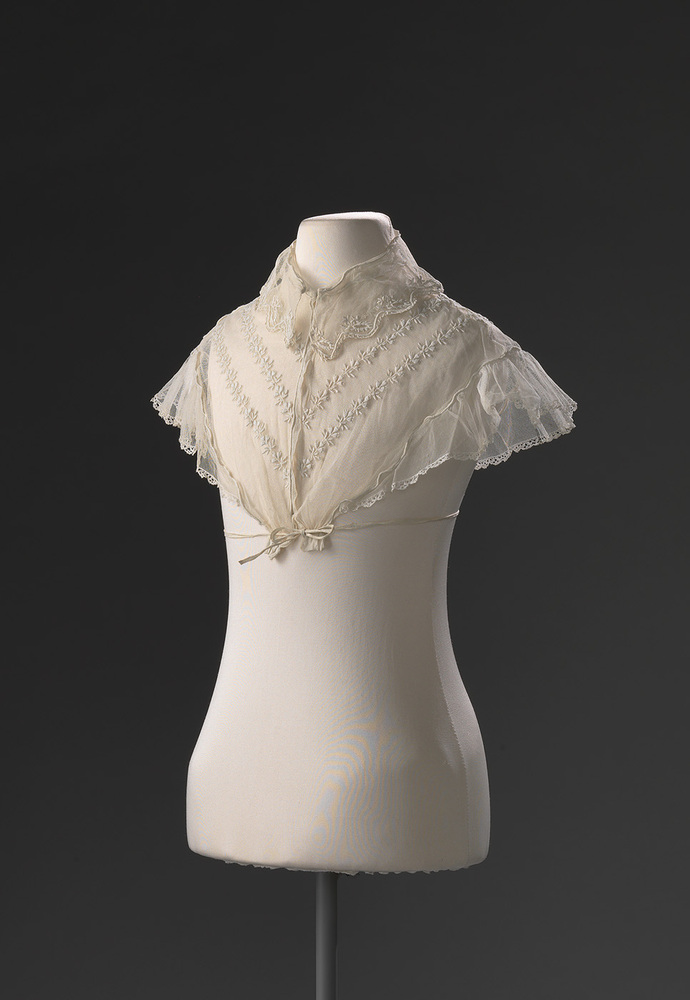 Witte canezou met hoge boord met strik, kanten randen en borduurwerk. De sluiting voor is met haak en gedraaid oog, De gedraaide haak en oog verdween na de empire periode. Het borduurwerk past in de empire periode. Het vulkoord langs de naden past in de periode rond 1830. De hoge boord is uitzonderlijk, en wordt gesloten met een strik.