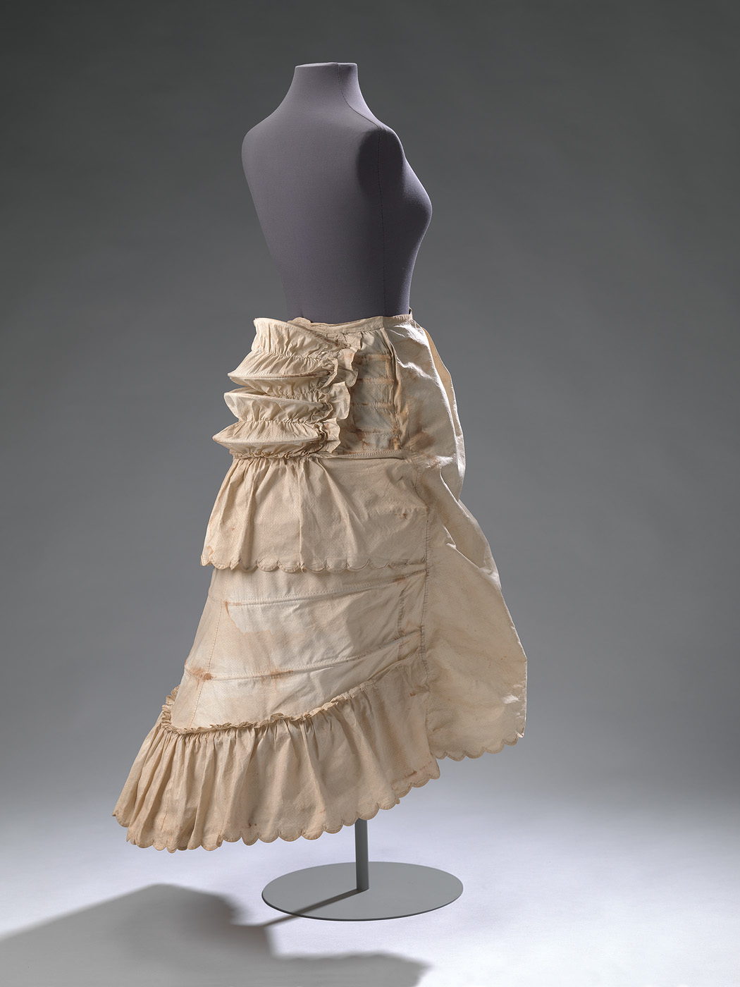 In 1874 waren de tournures voor onder feest- en balkleding het grootst. Dit model rijst zelfs aan de achterzijde boven het tailleniveau uit. Dit effect verkreeg de naaister door een extra harmonicavormig deel op de rok te bevestigen. Ook dit deel is verstevigd met horizontale baleinen van staal. De stroken met geschulpte zomen geven extra volume. De voorzijde van de onderrok sluit met glazen knopen.