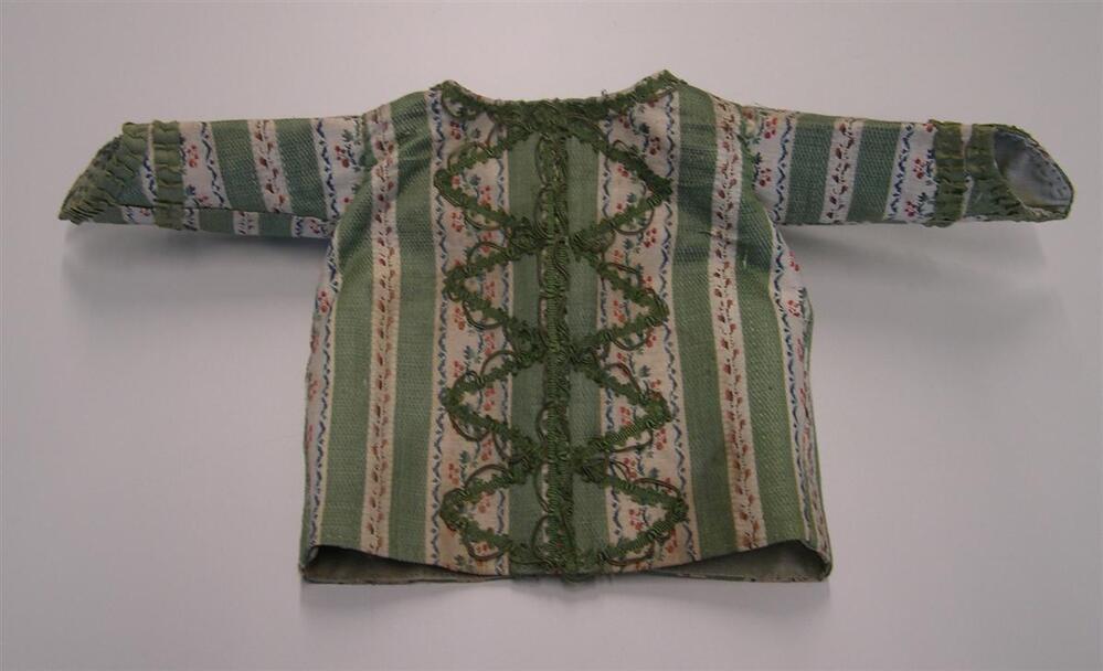 Babyjak voor een meisje van groene zijde met groene en witte strepen waarop kleine gekleurde bloemetjes. Afgezet met groen galon dat zigzag loopt. Aan de mouwen zijn afgezet met groen lint, het zelfd lint als op de rug voor de sluiting middenachter. Er ontbreken twee slutingsbanden. Voering van groene geglanste wol.
