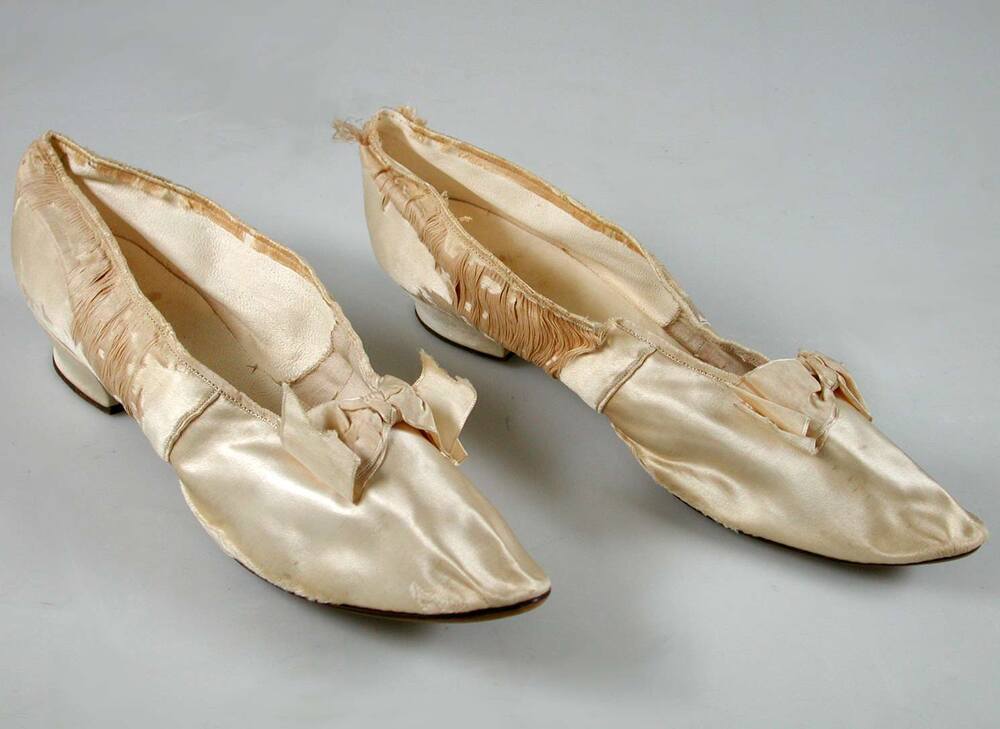 Bruidsschoenen van ivoorkleurige zijde met strikken van ripszijde op het voorblad. De hakken zijn plat. Het voorblad is van linnen. De achterkant en binnenzool zijn van dun, naturelkleurig leer. De zool in eveneens van leer. De schoenen zijn gevoerd.- Trefwoorden