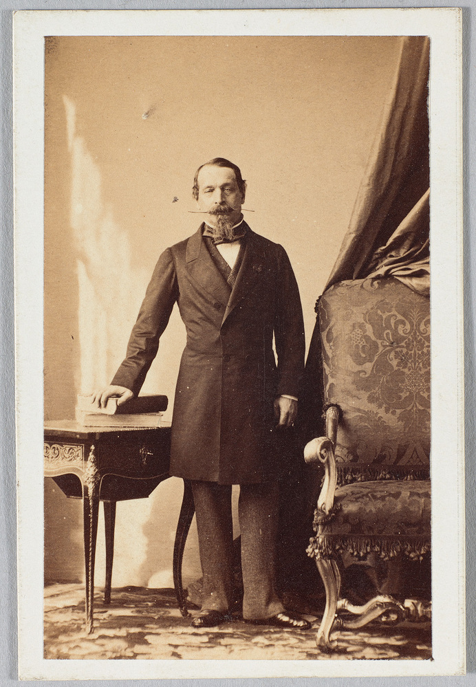 Met deze opname van Charles-Louis Napoleon Bonaparte (1808-1873) heeft Disdéri geschiedenis geschreven. De keizer was de eerste persoon die zich door de ‘uitvinder’ van de carte de visite liet portretteren. Opmerkelijk is het informele karakter van de foto, hij poseert niet in uniform maar in burger. Napoleon was klein van postuur, wat te zien is aan zijn lichaamslengte ten opzichte van de