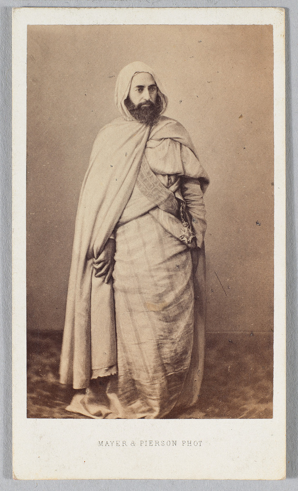 guerrillaoorlog tegen de Franse koloniale bezetter die uiteindelijk verloren werd. De gouverneur-generaal van Algerije nam hem tegen de afspraak in gevangen. Napoleon III hergaf hem zijn vrijheid in 1852. Al-Kader vestigde zich in Constantinopel en Damascus waar hij zich wijdde aan de studie van de filosofie en het schrijven van gedichten. Bij een godsdienstig conflict in Damascus in 1860 redde hij vele christenen het leven, reden voor Napoleon III om hem te vereren met het grootkruis van het Légion d’honneur. Op deze carte de visite draagt hij het ordeteken goed zichtbaar. Vier jaar later werd hij lid van de vrijmetselarij en ingewijd in de loge Pyramides te Parijs als vrijmetselaar van het Grootoosten van Frankrijk. ( Bert Vreeken)