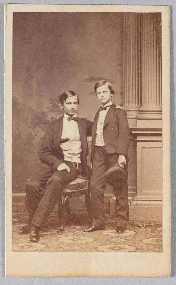 De foto toont kroonprins Ludwig (1845-1886) op veertienjarige leeftijd, vier jaar voor zijn kroning tot koning van Beieren in 1864. Naast hem staat zijn drie jaar jongere broer Otto (1848-1916). De beide prinsen waren onafscheidelijk. De excentrieke Ludwig ontpopte zich tot Wagner adept en een enthousiast bouwer van sprookjeskastelen. Nadat hij in 1886 - onder nooit opgehelderde omstandigheden - was verdronken volgde Otto hem op, maar deze vertoonde tekenen van schizofrenie en was niet tot regeren in staat. ( Bert Vreeken)