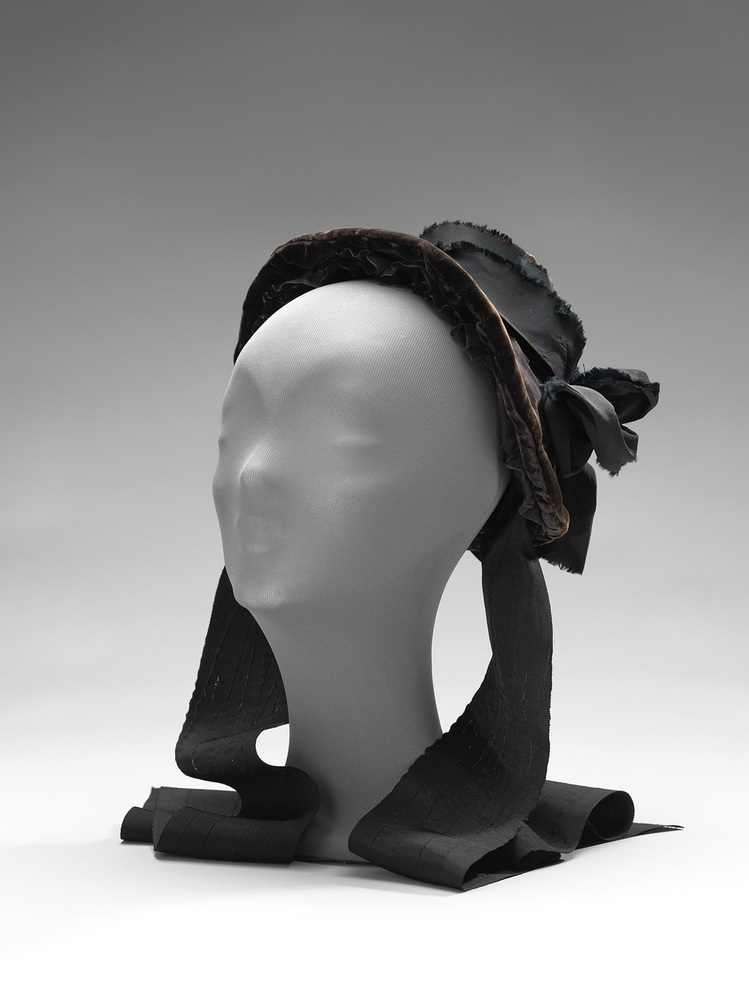 Bruinzwart/ zwart fluwelen hoed met zwart zijde lint, ruche van voile langs bovenzijde binnenkant. Twee zwarte linten langs de bol, en band. Band is niet gebruikelijk. Geen rouwhoed door ontbreken crepe. Niet modieus, past rond 1880.