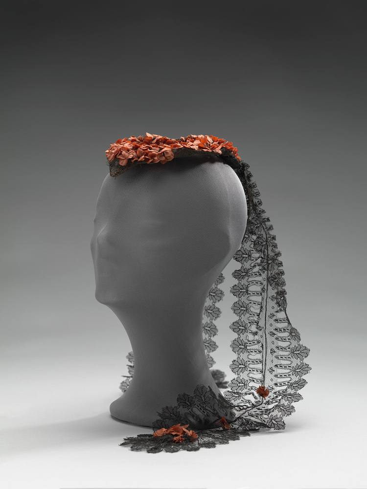 Coiffure van zwarte tule met rode imitatie bloemen van katoen (mogelijk begonia's) en lange slippen van zwart kant met rode imitatiebloemen van katoen.