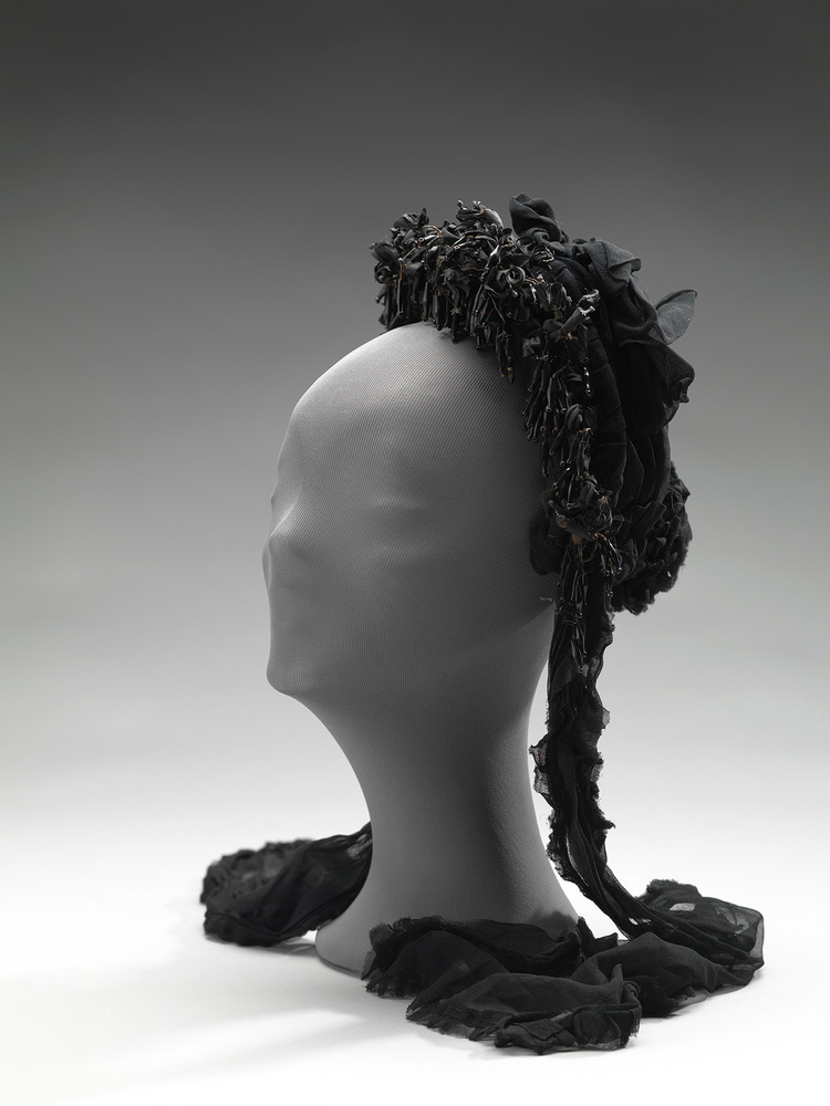 Hoed voor een vrouw van zwarte crepe zijde met afhangende slippen, die los werden gedragen. Garnering van voilen bloemen en kleine bloempjes met gitten. Binnenwerk van hoedengaas en laiton.