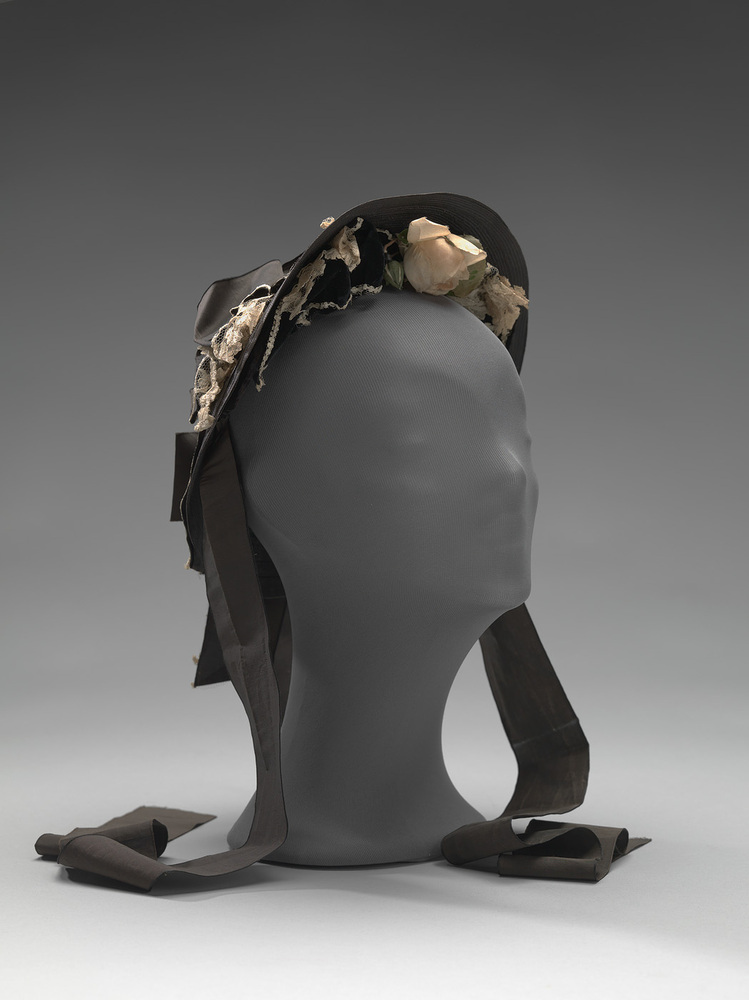 Hoed met rand en ronde bol, van donkerbruin bandstro. D. bruin fluwelen binnenrand. Versierd met bloemen, rozen, kant en fluwelen strikjes. Bol versierd met bruin zijden lint, afgezet met kant. Twee bruine zijden afhangende linten. Entree: lint van zwarte ripszijde.