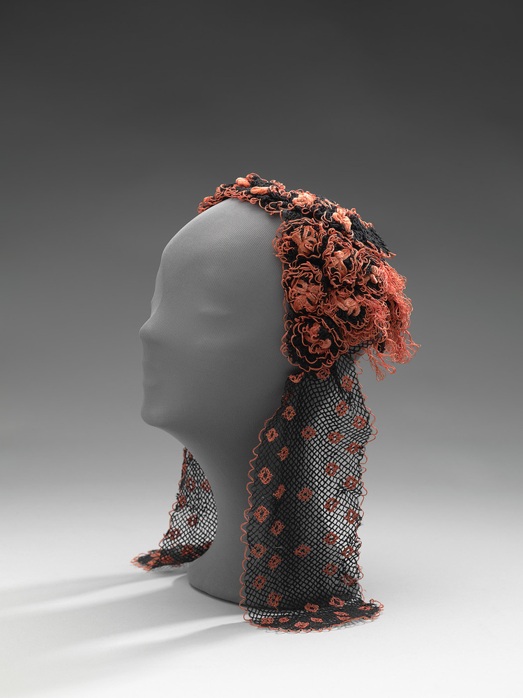 Zwarte coiffure van zwarte wol filetgeknoopt, met roze versiering in kettingsteek van zijden draad en versiering van chenille. Draden langs gezicht. Slippen die loshangen.